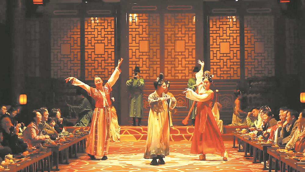 在河南洛阳隋唐洛阳城《唐宫乐宴》现场,游客扮演文武百官进宫赴宴,沉浸式体验大唐的服章之美、歌舞之妙、人物风流。 图据新华社
