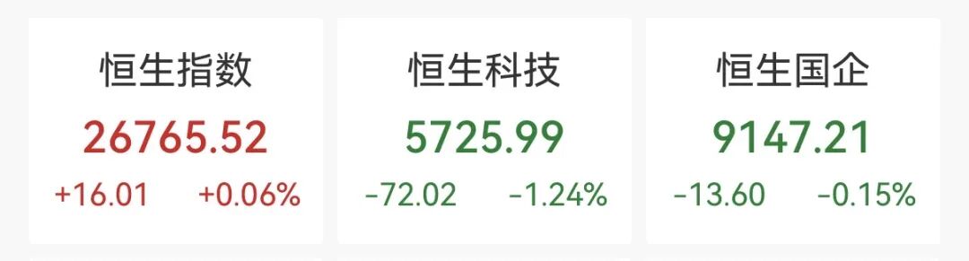 1月26日,港股全日呈现高开低走行情,最终三大指数涨跌不一,仅恒生指数收涨。截至收盘,恒生指数涨0.06%,报26765.52点;恒生科技指数跌1.24%,报5725.99点;恒生国企指数跌0.15%,报9147.21点。